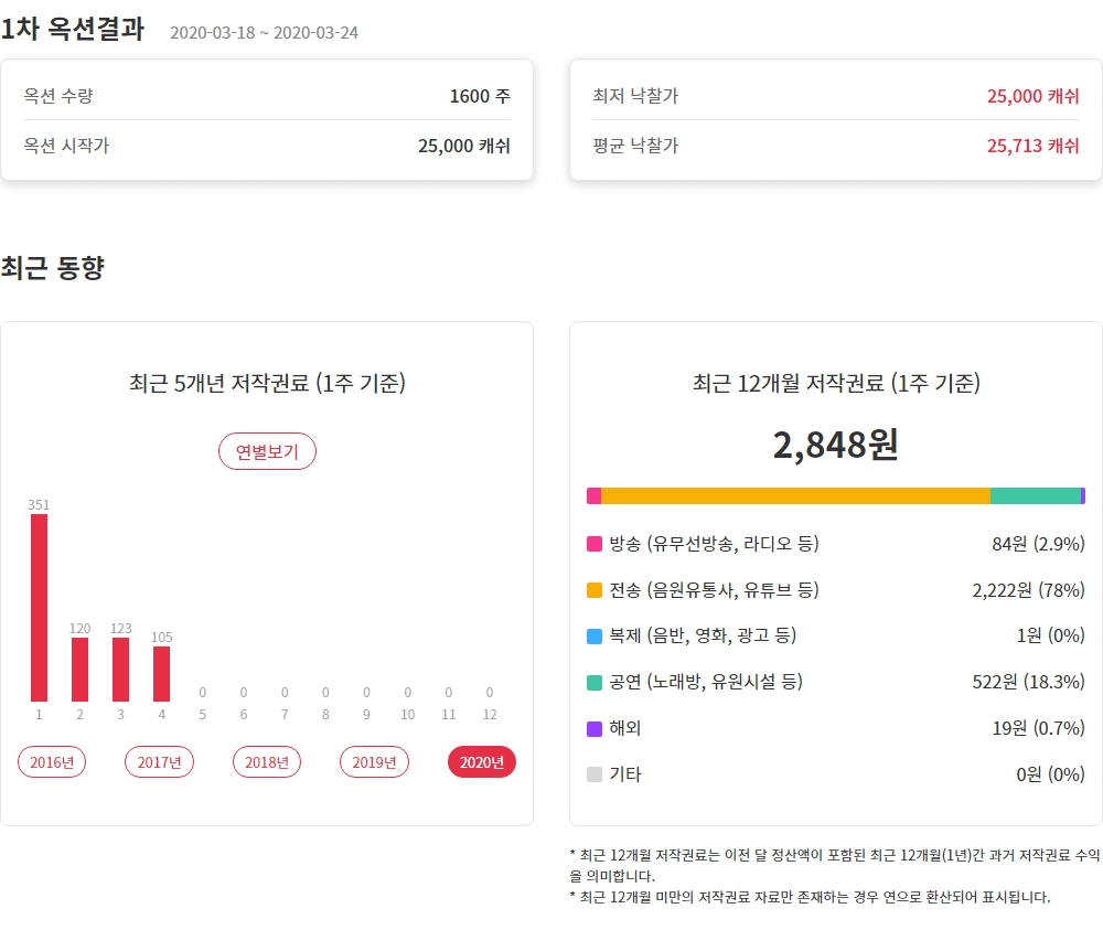 그리고 해당 가격에 대한 저작권 수익률은 어떻게 되는지 나옵니다.