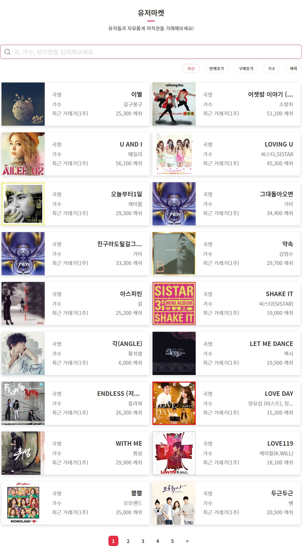 유저마켓에 들어가게되면 어떤 노래가 거래로 올라왔는지 확인 하실 수 있습니다.